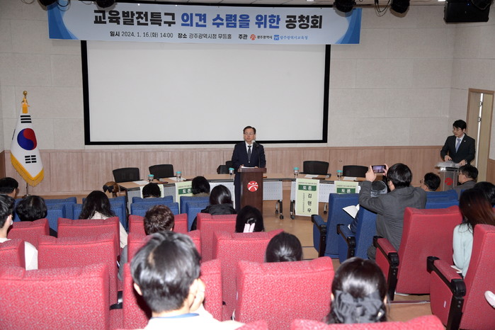 [광주=프레스뉴스] 강래성 기자= 광주광역시(시장 강기정)는 광주광역시교육청(교육감 이정선)과 함께 16일 시청 무등홀에서 ‘교육발전특구 공모사업 공청회’를 열어 광주형 교육발전특구 개발에 앞서 각계 의견을 수렴했다.