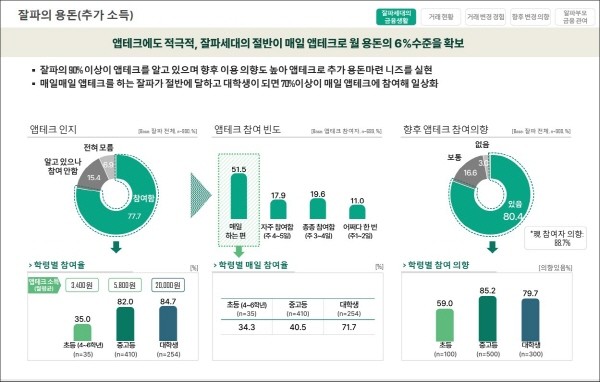 잘파세대 10명 중 8명이 용돈을 받고, 앱테크로 추가 용돈도 마련하며 받은 용돈의 일부를 남겨 규칙적 또는 간헐적으로나마 저축을 생활화하고 있다. 특히, 알파세대는 중고등학생보다 용돈은 적지만 더 많은 용돈을 남기고 더 규칙적으로 저축하는 등 성실한 금융생활을 실천하는 모습이다. 알파세대의 바른 금융생활은 부모의 영향이 크기 때문이다.