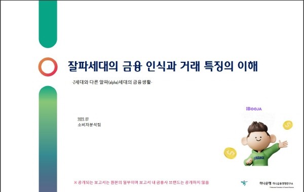 [프레스뉴스] 김대일 기자= 하나은행(은행장 이승열) 하나금융경영연구소(소장 정중호, www.hanaif.re.kr)는 잘파세대(서베이 대상: 초등 고학년~대학생) 금융행태를 분석한 「잘파세대(*)의 금융 인식과 거래 특징의 이해」보고서를 발간했다.