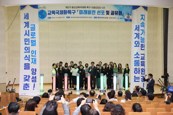 이날 행사는 월곡중학교 학생들의 K-POP 공연을 시작으로 이정선 교육감과 오영걸 광산부구청장의 인사말, 축사, 미래비전 선포 및 공유회 순으로 진행됐다. 특히 광산교육국제화특구 비전인 ‘세계시민의식을 갖춘 글로벌 인재 양성’을 알리고 핵심과제인 ▲세계시민교육 플랫폼 구축 ▲세계시민교육 ▲글로벌 교원 육성 ▲공존·상생의 글로컬 교육 등에 대한 설명이 있었다.