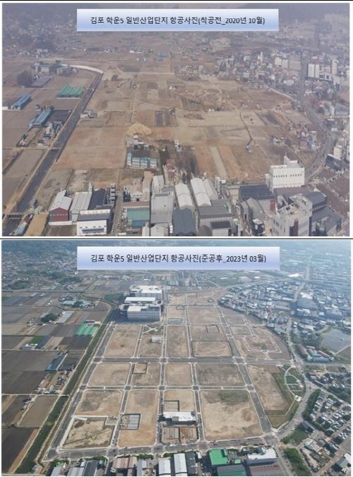 ▲김포 학운5 일반산업단지 준공 전·후 항공사진(경기도북부청) |