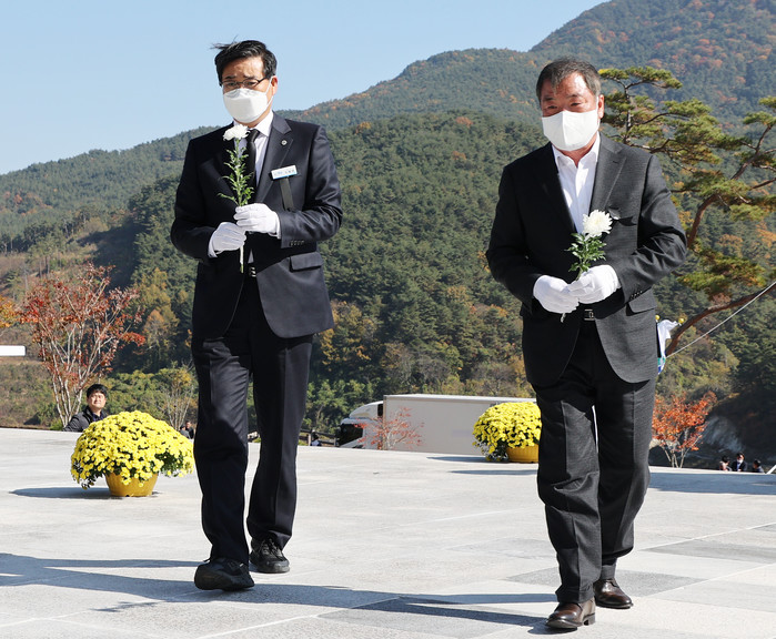 | ▲ 진병영 함양군수(좌)와 이승화 산청군수(우)가 합동위령제에서 헌화 하고있다.(사진=함양군) |