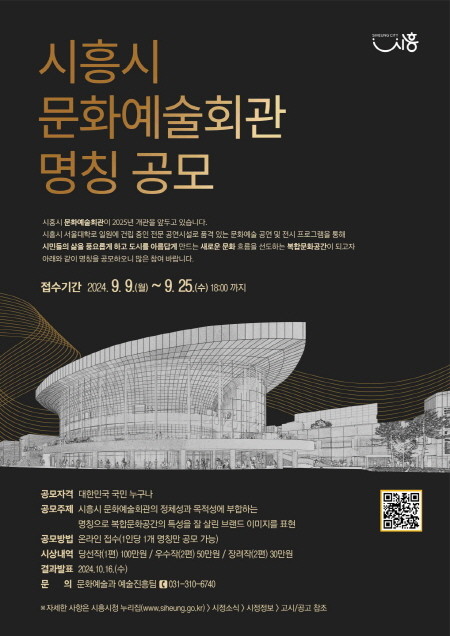 공모 내용은 시흥시 문화예술회관(가칭)의 정체성과 독창성을 잘 표현할 수 있는 이름을 찾기 위한 것으로, 브랜드 가치와 상징성을 반영한 아이디어를 모집한다. 참가 자격 및 접수 방법에 관한 자세한 정보는 시흥시 누리집의 ‘시정소식-시정정보’ 고시공고 게시판에서 확인할 수 있다.