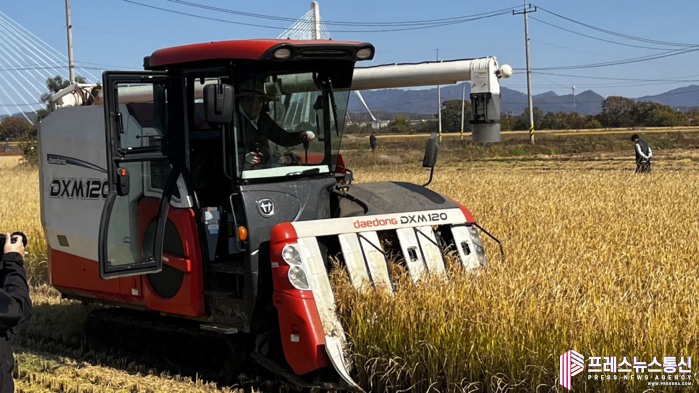 | ▲김동연 도지사가 콤바인으로 경기미를 수확하고 있다.(사진=경기도) |