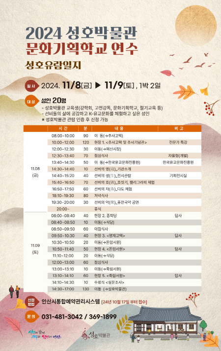 오는 11월 8일 성호박물관에서 1박 2일에 걸쳐 진행되는 ‘성호유람일지’는 한국유교문화진흥원에서 성인을 대상으로 개최하는 연수 프로그램에 참여하는 방식으로 진행된다.