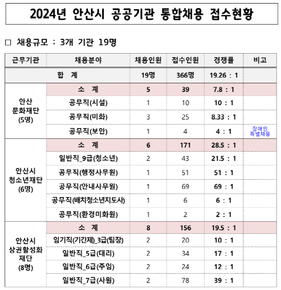 지난달 22일부터 28일까지 2024년 안산시 산하 공공기관 정기 통합채용 응시원서를 접수한 결과 3개 기관 19명 선발에 총 366명이 접수했다.