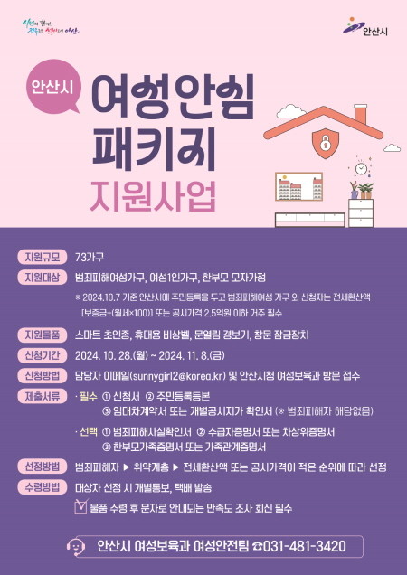 지원 대상은 2024년 10월 7일 기준 안산시에 주민등록을 둔 ▲범죄피해여성가구 ▲여성 1인 가구 ▲한부모 모자가정 등 총 73가구이다. 여성 1인 가구와 한부모 모자가정은 전세환산액 또는 공시가격 2.5억 원 이하에서 거주해야 한다.