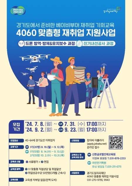 [프레스뉴스] 류현주 기자= 경기도일자리재단(이하 재단)과 경기도는 베이비부머 재취업 기회를 위해 7월 8일부터 31일까지 ‘2024년 4060 맞춤형 재취업 지원사업’ 교육에 참여할 2차 훈련생 1기를 모집한다.