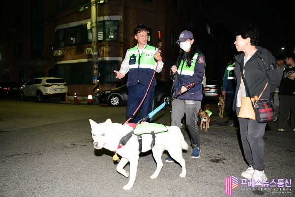 이날 합동 순찰은 반려견 순찰대 25개 팀이 참여해 2개 조로 나눠 1시간 가량 이동 인근 주택가의 치안 취약 구역 1.5㎞ 구간을 점검했다. 이민근 시장은 1살 반려견 아큼과 함께 직접 순찰 활동에 나섰다. 특히 인적이 드문 주택가부터 유동 인구가 많은 상가 지역까지 안전 사각지대의 위험 요소 및 범죄예방 시설물 이상 유무 확인 등 점검 활동에 중점을 뒀다.