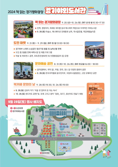 특히 9월 28일에는 ‘책 읽는 경기평화광장’, ‘문화예술공연’, ‘도민 마켓’ 3개의 행사가 모두 함께 진행된다. 이날 ‘책 읽는 경기평화광장’ 야외도서관 공간에서는 애니메이션 동화 낭독, 독서골든벨, 목공체험놀이 부스 등 특별행사가 별도로 개최된다.