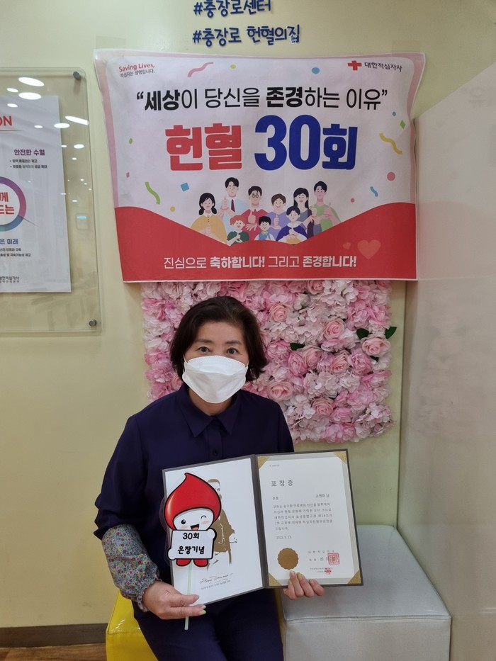 대한적십자사는 숭고한 인류애 정신을 발휘한 고영미 봉선1동장에게 존경과 축하의 마음을 담아 30번째 혈액 나눔에 동참한 이들에게 수여하는 은장 포장증을 이날 수여했다.