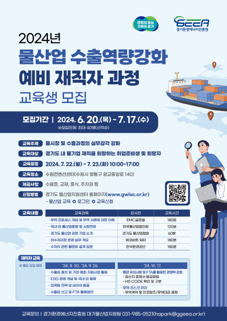 | ▲2024년 경기도 물산업 수출역량강화 예비 재직자 과정 교육생 모집 포스터(사진=경기도) |