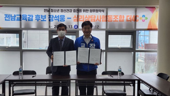 [전남=프레스뉴스] 강래성 기자= 장석웅 전남교육감 후보가 심리상담사협동조합과 상호 업무협약을 체결했다.