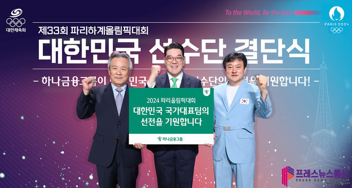 | ▲하나금융그룹은 지난 9일 서울 올림픽공원 올림픽홀에서 개최된 ‘2024 파리올림픽 결단식’에서 국가대표 선수단의 선전을 기원하기 위한 격려금을 전달했다. 사진 왼쪽부터 이기흥 대한체육회장, 이은형 하나금융그룹 부회장, 정강선 올림픽 선수단장이 파리올림픽에 출전하는 대한민국 국가대표 선수단의 선전을 기원하며 화이팅을 외치고 있다.(사진=하나금융그룹) |