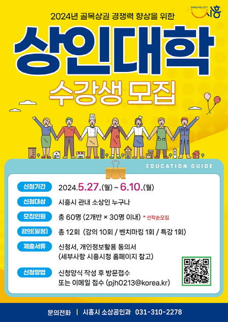 상인대학 교육 일정 및 참여 신청 관련 세부 사항은 시흥시청 누리집을 통해 확인할 수 있다. 기타 문의 사항은 시흥시청 소상공인과로 문의하면 된다.