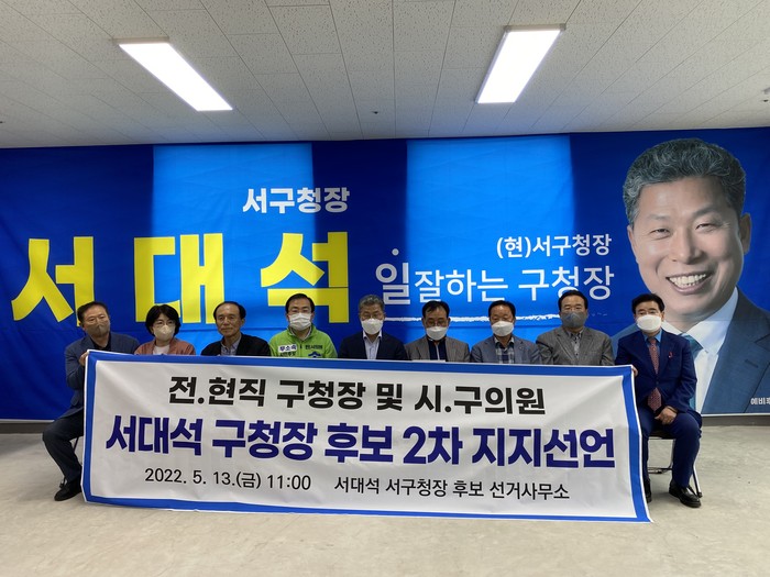 이에 고무된 서대석 청장은 “선배 구청장님들과 의회 의원님들의 지지선언으로 다시 한번 서구민들의 민심은 저 서대석에게 있다는 것을 느겼다.”며 “오늘 지지선언을 해 준 선배들의 지혜와 경험을 빌려 기필코 승리해 주민들에게 보답하겠다”고 말했다.