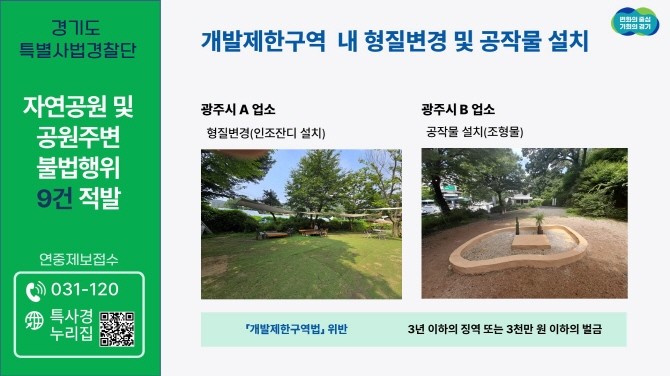 사례별로 살펴보면 광주시 A업소는 개발제한구역에 허가 없이 인조잔디를 깔아 토지 무단 형질 변경 건으로 적발됐으며, B업소는 허가 없이 정원 조형물을 설치해 적발됐다.