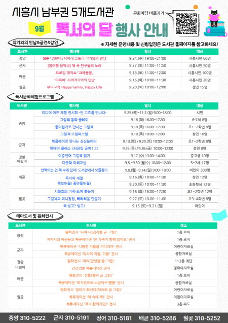 ▲시흥시 남부권 도서관 9월 독서의 달 행사 안내 포스터(사진=시흥시) |