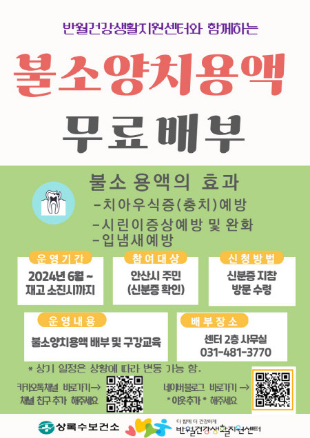 반원건강생활지원센터는 안산시민의 구강 및 치아 건강을 위해 이날부터 재고 소진 시(선착순)까지 센터 2층에서 시민을 대상으로 불소 양치용액을 무료로 배포한다고 밝혔다.