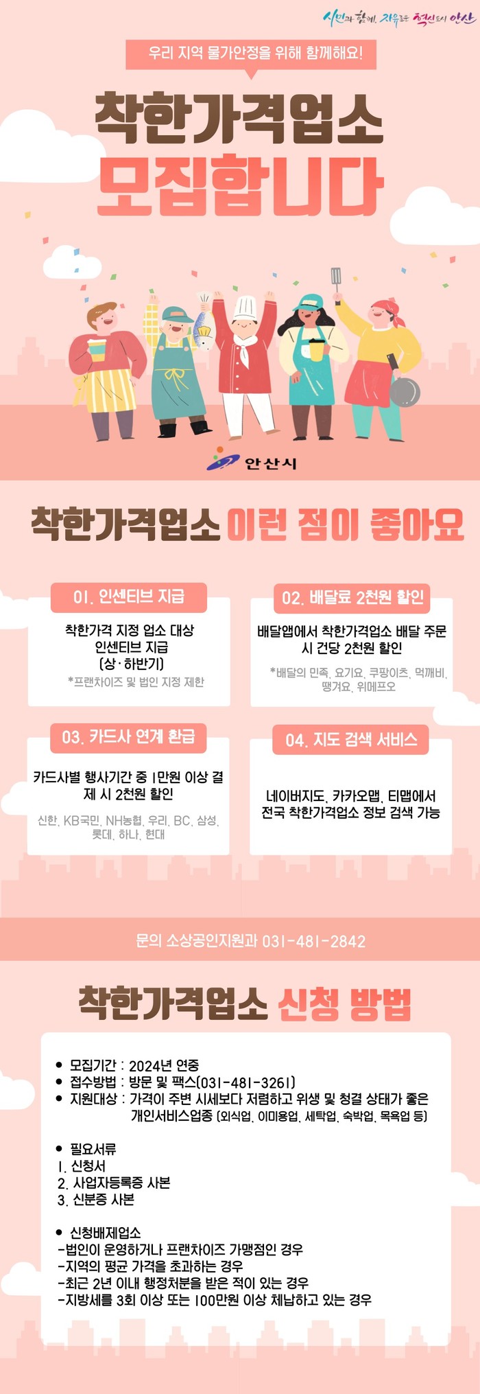 착한가격업소로 지정되면 착한가격업소 지정 표지판을 제공하고 종량제봉투와 업소용 등이 지원된다. 행정안전부와 협업해 착한가격업소 홍보 등의 혜택도 제공된다. 자세한 사항은 안산시청 고시공고란을 참고하거나 소상공인지원과에 문의 하면 된다.