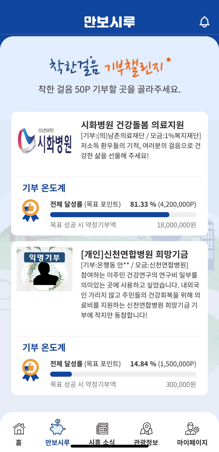 아울러, 연말에는 최다 기부 참여자 등을 선정해 소정의 기념품을 제공하는 ‘만보시루 기부 챌린지 어워즈’를 추진할 계획이다.