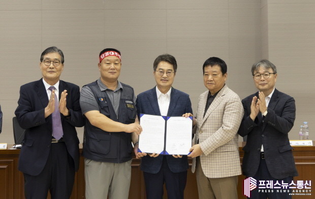 ▲1일 오전 김동연 경기도지사가 경기지방노동위원회에서 열린 경기도 버스 노사 협상장을 방문하여 협약서를 들고 기념촬영을 하고 있다.(사진=경기도) |
