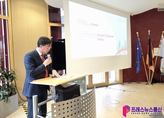 | ▲이민근 안산시장은 지난 19일(현지시간) 첨단 제조 산업의 집적지이자 R&D 인프라가 풍부한 독일 NRW주에 소재한 한독기술협력센터(KGTCC)를 방문, 독일 기업체 및 관계자 20여 명을 대상으로 투자유치설명회를 개최하고 외투기업 유치에 나섰다.(사진=안산시) |