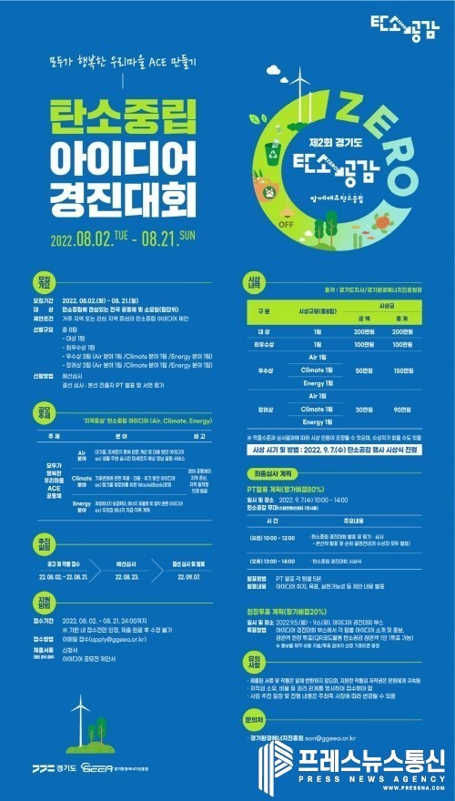 [프레스뉴스] 장현준 기자= 경기도와 경기환경에너지진흥원은 2050년 탄소중립 실현을 위한 생활 밀착형 정책을 발굴하고 도입하기 위해 ‘탄소중립 아이디어 경진대회’를 개최한다고 8일 밝혔다.