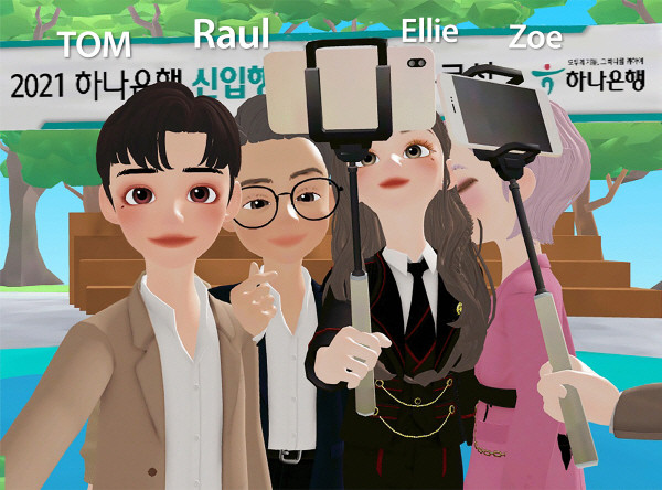 ▲ 박성호 하나은행장(사진 왼쪽에서 2번째, 캐릭터 라울(Raul))이 메타버스 내 「하나글로벌캠퍼스」에서 신입행원들과 '셀카'를 촬영하고 있다.(사진=하나은행) |