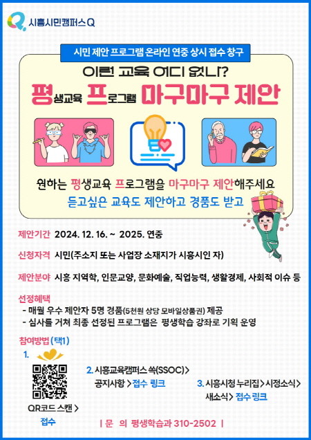‘평생학습 프로그램 마구마구 제안’은 2024년 12월 16일부터 2025년 연말까지 진행되며, 시흥시에 주소나 사업장이 있는 시민이라면 누구나 참여할 수 있다.