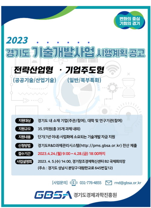 | ▲ 2023년 경기도 기술개발 사업 시행계획 공고 포스터(사진=경기도경제과학진흥원) |