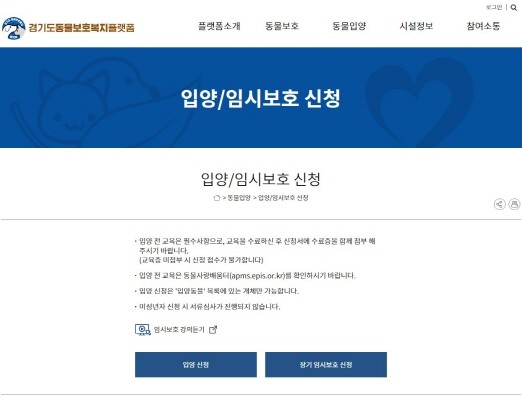 ▲ 도우미견 나눔센터 보호동물 임시보호 신청화면(사진=경기도북부청) |