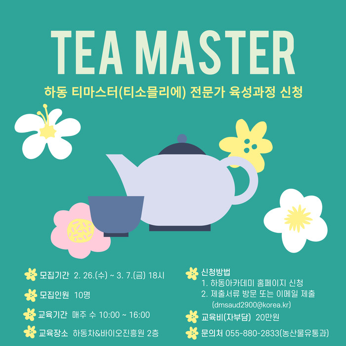 한편, 티 마스터 과정 수료 시 사단법인 한국티협회와 한국티소믈리에연구원이 공동 주관하는 2급 자격시험에 응시할 수 있는 자격과 함께 하동야생차문화센터에서 티 마스터로 근무할 수 있는 기회도 제공될 예정이다.