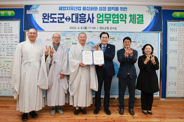 [전남=프레스뉴스] 박정호 기자= 전남 완도군(군수 신우철)은 지난 4월 8일 해양치유산업 활성화를 위해 대한불교 조계종 제22교구 본사인 대흥사(주지 법상 스님)와 업무 협약을 체결했다.