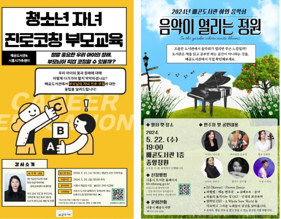 ‘청소년 자녀 진로 코칭 부모 교육’ 및 ‘음악이 열리는 정원’은 시흥시 도서관 누리집에서 5월 20일 오후 6시까지 신청하면 된다. 궁금한 사항은 시흥시 배곧도서관으로 문의하면 된다.