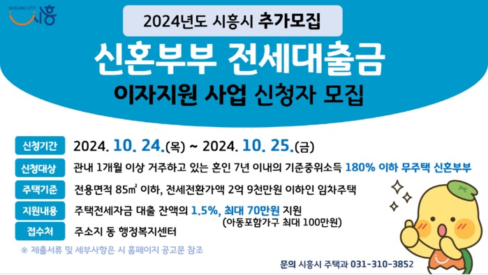 [프레스뉴스] 장현준 기자= 시흥시(시장 임병택)가 ‘신혼부부 전세대출금 이자지원 사업’대상자를 추가 모집한다.