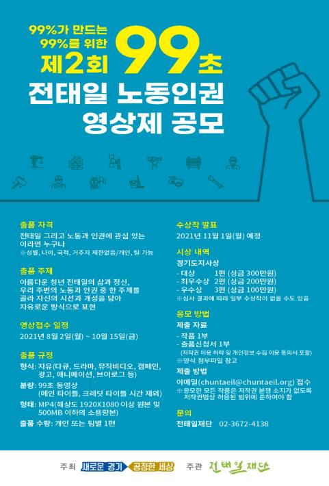 4일 도에 따르면, 이번 공모전은 99%의 사람들을 위해 살아간 전태일과 또 따른 전태일인 99% 사람들의 이야기를 길지만 짧고, 짧지만 긴 시간인 99초에 담은 영상작품을 통해 노동존중 정신을 널리 알리겠다는 의도다.
