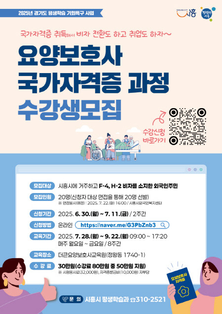 [프레스뉴스] 장현준 기자= 시흥시(시장 임병택)는 2025년 경기도 평생학습 기획특구 사업의 일환으로, 외국인주민의 안정적인 지역 정착과 취업을 지원하기 위한 ‘요양보호사 국가자격증 과정’을 개설하고, 6월 30일부터 7월 11일까지 수강생 20명을 모집한다.