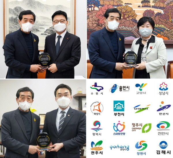 ▲ 전국대도시시장협, 지방연구원법 개정 공로 국회의원에 감사패 수여(왼쪽 상단부터 시계방향으로 윤화섭 안산시장과 박광온 의원, 서영교 의원, 김남국 의원)사진=안산시 |