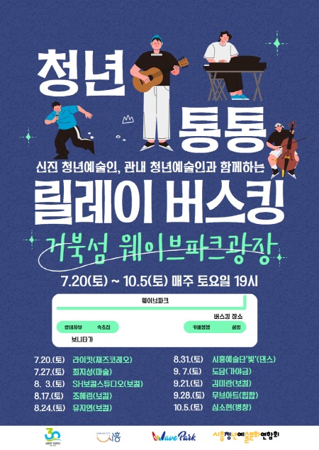 [프레스뉴스] 장현준 기자= 시흥시(시장 임병택)는 청년문화 예술 활성화의 일환으로 ‘청년 통통 릴레이 버스킹’을 오는 7월 20일부터 10월 5일까지 매주 토요일 저녁 7시에 거북섬 웨이브파크 광장 일대에서 진행한다.