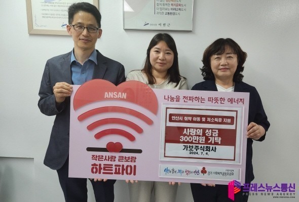 [프레스뉴스] 장현준 기자= 안산시(시장 이민근)는 지난 4일 가보주식회사(대표 오승원)로부터 관내 저소득 가정에 사용해 달라며 사랑의 후원금 300만 원을 기탁받았다고 5일 밝혔다.