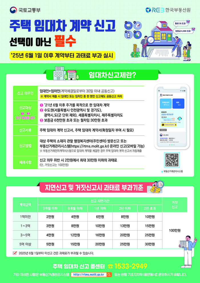 계약일로부터 30일 이내의 신고 기간을 넘길 시 최소 2만 원에서 최대 30만 원, 거짓으로 신고할 경우 100만 원의 과태료가 부과된다.