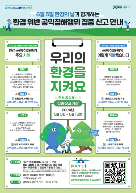 도는 해당 기간 신고를 독려할 수 있는 생활 속 맞춤형 홍보도 함께 추진한다. 일상생활에서 마주칠 수 있는 주요 공익침해 사례와 제보 방법을 구체적으로 안내해 ‘환경을 지키기 위한 공익제보’라는 실천 방안이 있음을 널리 알리고자 하는 것이다.