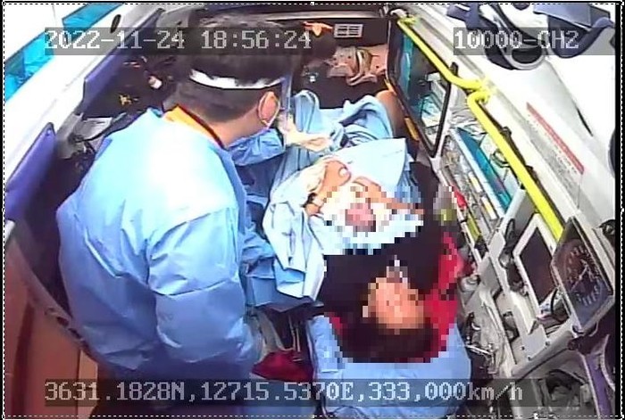 구급차 안에서 환자의 분만통이 점점 심해지고 신생아 머리가 관찰되는 등 상황이 급박해지면서 구급대원들은 119종합상황실 구급지도 의사에게 영상통화를 시도했다.
