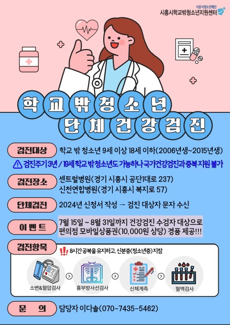 학교 밖 청소년을 대상으로 ▲상시 건강검진 신청 ▲건강검진 동행 서비스 ▲특별건강검진 및 치료비 지원사업을 운영 중이며, 시흥시청소년재단 누리집 혹은 카카오톡 채널 ‘시흥시꿈드림’ 등을 통해 확인할 수 있다. 자세한 사항은 시흥시학교밖청소년지원센터로 문의하면 안내받을 수 있다.