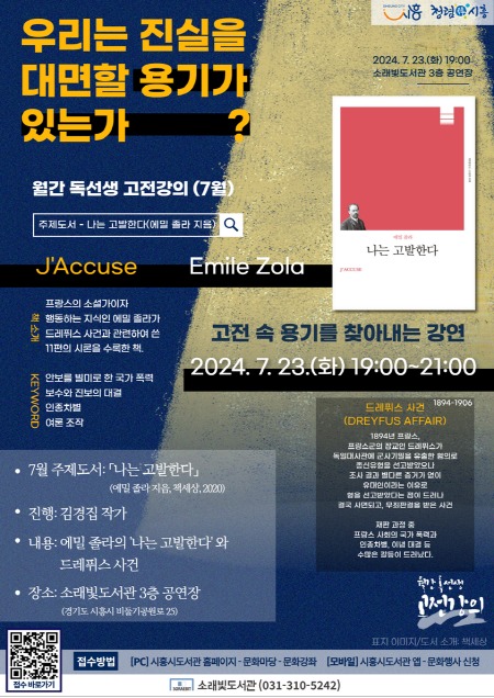이번 7월 강연에서는 에밀 졸라의 고전 「나는 고발한다」를 중심으로 ‘우리는 진실을 대면할 용기가 있는가?’를 주제를 탐구할 예정이다. 강연은 인문학자 김경집 작가가 맡아 「나는 고발한다」의 집필 배경이 되는 ‘드레퓌스 사건(19세기 말, 프랑스에서 유대인 사관(士官) 드레퓌스의 간첩 혐의를 둘러싸고 정치적으로 큰 물의를 빚은 사건)’을 다루며, 역사와 고전을 함께 읽는 시간을 제공한다.