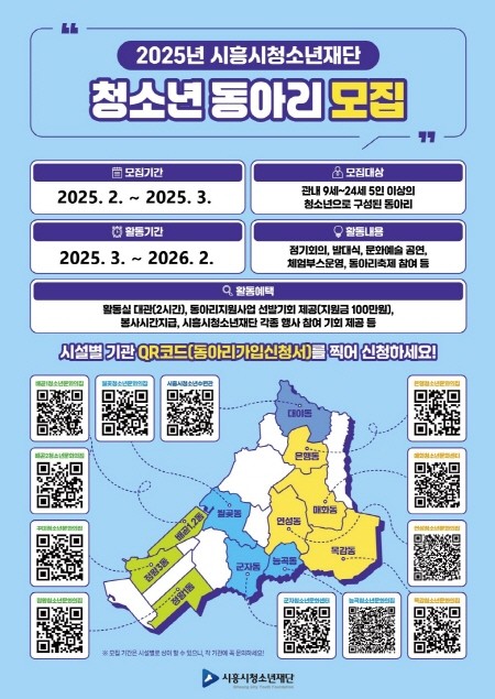 [프레스뉴스] 장현준 기자= 재단법인 시흥시청소년재단 내 12개의 청소년시설에서 청소년들의 다양하고 건전한 동아리 활동을 지원하고자 2025년 청소년동아리를 2월부터 3월까지 두 달간 기관별로 모집한다.