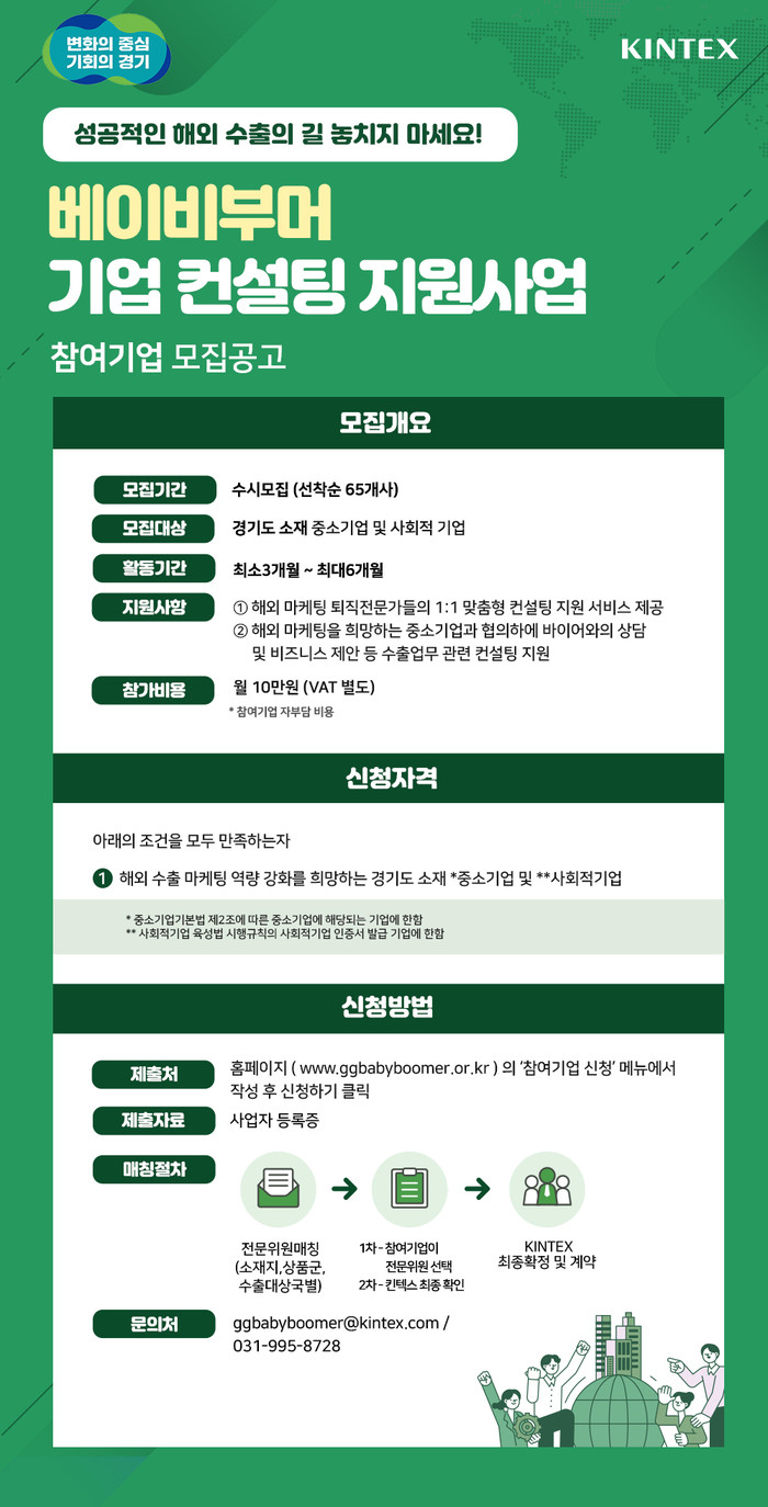 경기도는 4월 9일부터 인원 마감까지 이런 내용을 담은 ‘2024년 베이비부머 기업 컨설팅 지원사업’ 참여자와 참여기업을 모집한다.
