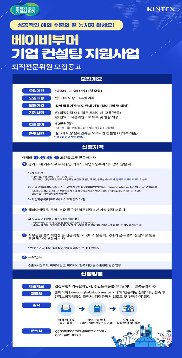▲2024년 베이비부머 기업 컨설팅 지원사업 퇴직전문위원 모집 공고 포스터(사진=경기도) |