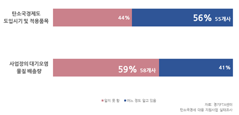 경기도는 탄소국경조정제도 시행과 관련해 지난 3월 ‘환경·사회·지배구조(ESG)경영 및 탄소국경세 교육·설명회’를 신규 개설해 9월까지 진행했다. 참여기업 144개 사 중 98개 사가 응답한 이번 조사에서는 탄소국경조정제도의 도입 시기와 적용 품목에 대해 과반수(56%·55곳)가 ‘어느 정도 알고 있다’고 응답했으나 사업장의 대기 오염물질 배출량을 알고 있는지에 대해서는 과반수(59%·58곳)가 ‘알지 못한다’고 응답했다.